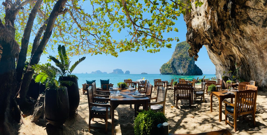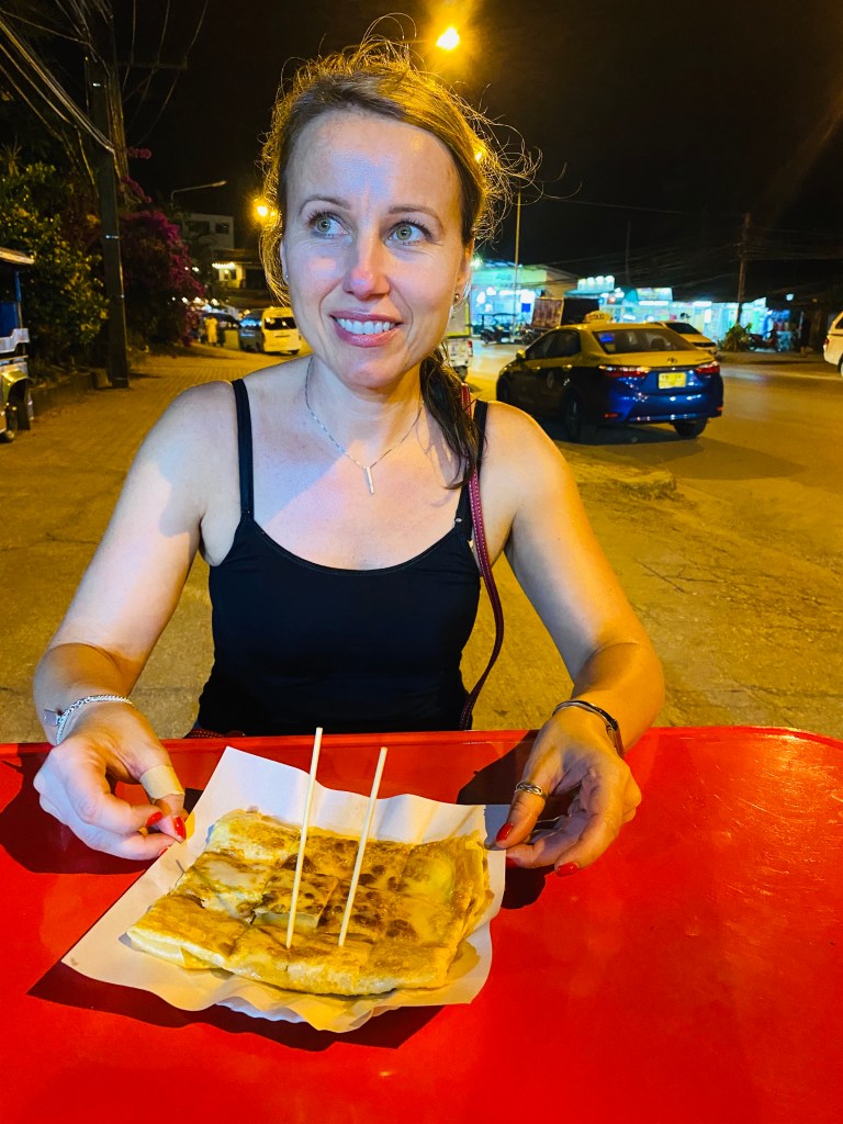 On our final day, which was also my birthday, we headed to Ao Nang beach to catch one of the long tail boats to take us to Railay West beach. This is the most iconic beach in this area with striking cliffs towering around it. You can’t get here any other way other than taking a boat due to high limestone cliffs cutting off mainland access. What used to be serene places, Ao Nang and even Railay beach are now so polluted with the noise and fumes from the long tail boats. What a shame but such is the cost of global progress and tourism I guess… It was getting hot and crowded so we headed inland for a little exploration. Again it’s changed so much since 2007, when just a handful of small resorts could be found here. Now there’s a whole mini town wedged in between the peaks with bars, restaurants and mini markets so you can stay here without feeling stuck. We made our way to Rayavadee – an upmarket resort with a special bar / restaurant that’s built into a limestone cave on the Phranang beach called The Grotto. Since it was my birthday, we decided to treat ourselves to a lunch and cocktails here. It was delicious and the views were just breathtaking. Back on the mainland, we spoiled ourselves a bit more with last foot massage and afterwards, with one of those tasty rotti pancakes – at least some things stay as I remember them, nowhere else pancakes are this tasty than here in Thailand!