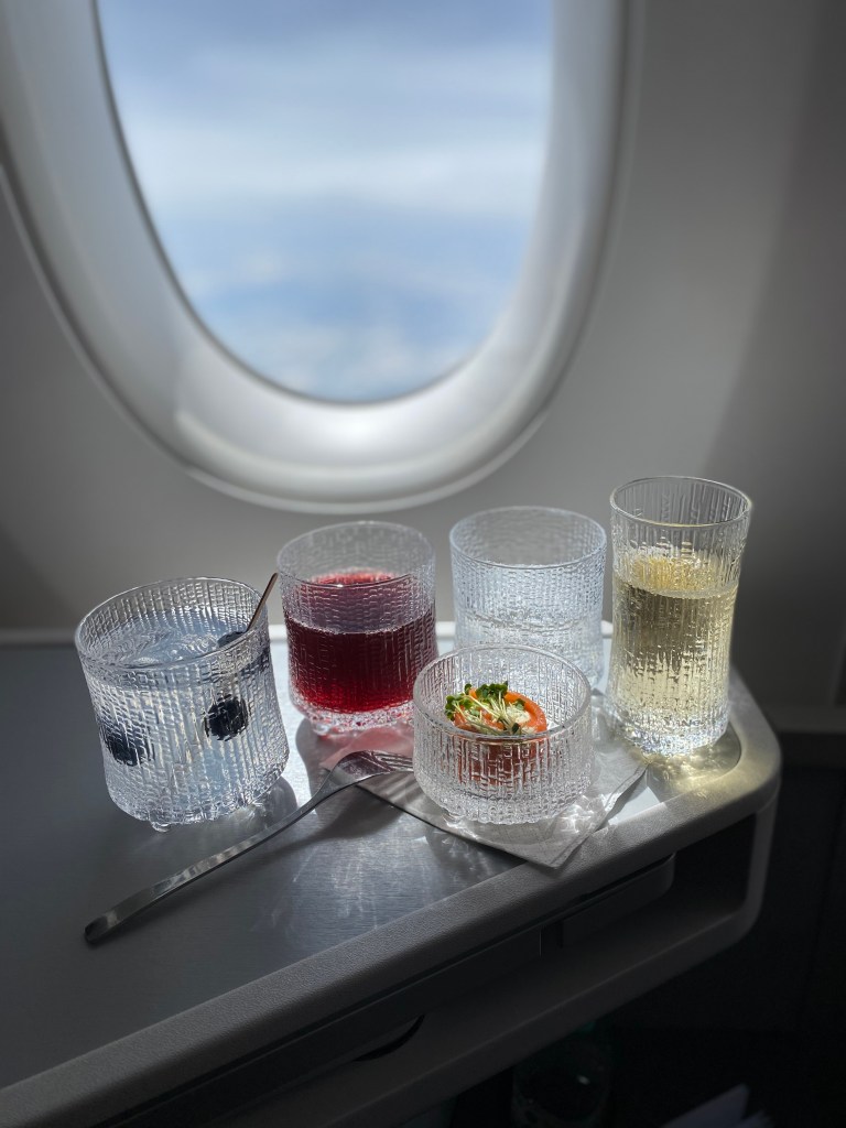 Loved their Nordic gin with blueberries and blueberry juice! Service was good, although the crew went to take an order from one passenger, then went to prepare their drinks and delivered it to them before moving onto the next passenger which didn’t exactly seem very efficient… when we boarded, the crew was offering drink on a tray with only one glass of champagne, the rest were juices or water. Of course almost everyone wanted a glass of champagne so the poor cabin crew kept running back and forth for more champagne but only ever replenishing the one glass of champagne without ever thinking to add more … also almost on every flight the crew had some issues balancing the signature Finnair glasses on the trays! 😂 we witnessed two accidents where all glasses slid off and went all over the floor. Luckily the glasses are so strong that nothing broke. Once I was being served, 3 glasses nearly landed in my lap – I had a very lucky save haha.